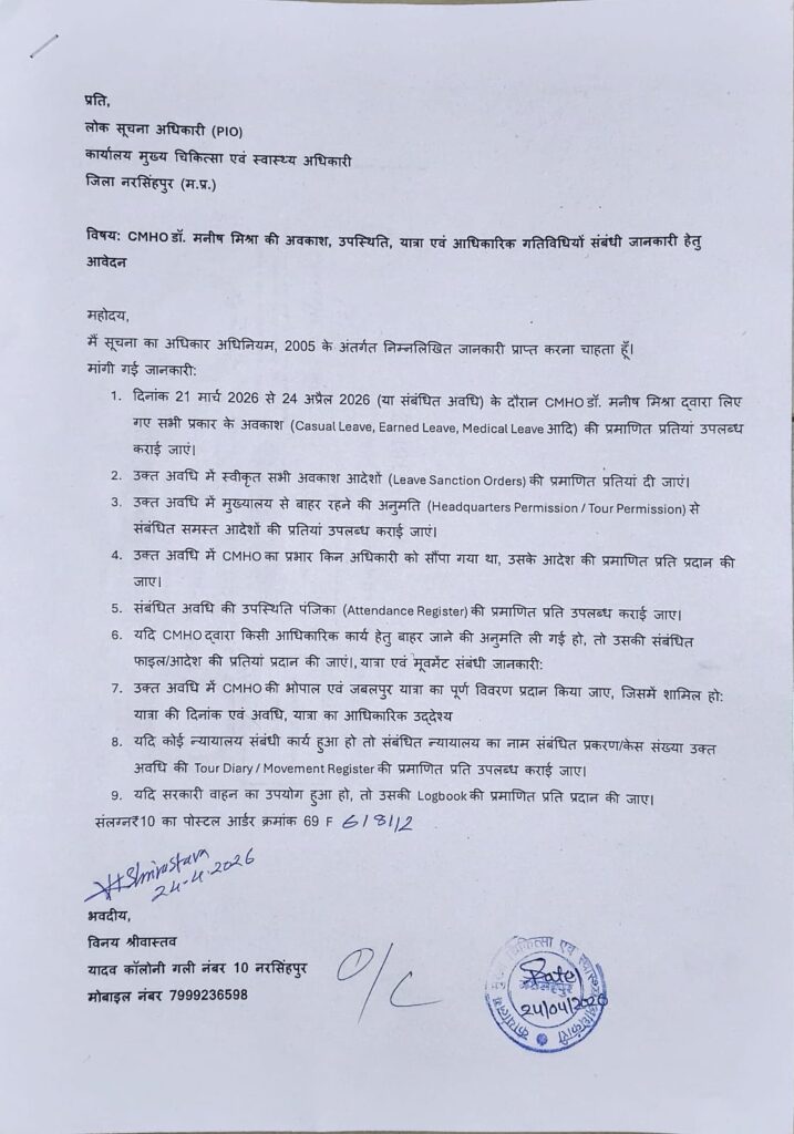 RTI आवेदन में यह स्पष्ट रूप से मांग की गई है कि संबंधित अवधि में CMHO की सभी गतिविधियों का रिकॉर्ड उपलब्ध कराया जाए, ताकि यह स्पष्ट हो सके कि अनुपस्थिति और अवकाश नियमों के अनुसार था या नहीं।