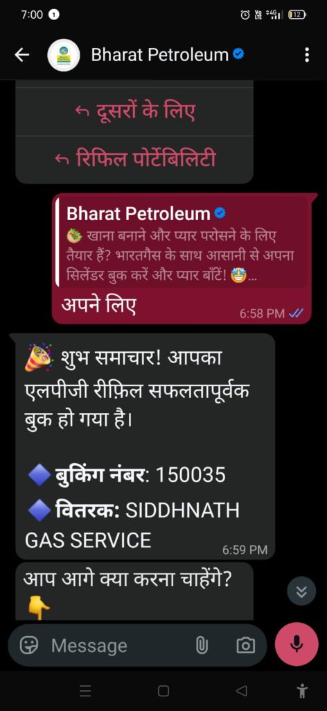 उपभोक्ता 1800224344 नंबर पर WhatsApp के माध्यम से भी गैस सिलेंडर बुक कर सकते हैं। इसके लिए WhatsApp पर “Hi” लिखकर भेजना होता है, जिसके बाद बुकिंग का विकल्प मिल जाता है।