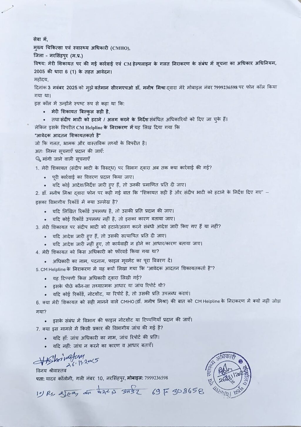 इस पूरे प्रकरण को और गंभीर बनाता है वह तथ्य, जब 3 नवंबर 2025 को स्वयं मुख्य चिकित्सा एवं स्वास्थ्य अधिकारी डॉ. मनीष मिश्रा ने शिकायतकर्ता विनय श्रीवास्तव से फोन पर बातचीत की थी।