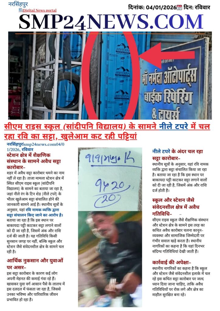 नरसिंहपुर। शहर में अवैध सट्टा कारोबार थमने का नाम नहीं ले रहा है। ताजा मामला स्टेशन क्षेत्र में स्थित सीएम राइस स्कूल (सांदीपनि विद्यालय) के सामने का सामने आया है, जहां नीले रंग के टिन शेड (नीले टपरे) के भीतर खुलेआम सट्टा संचालित होने की बात कही जा रही है।