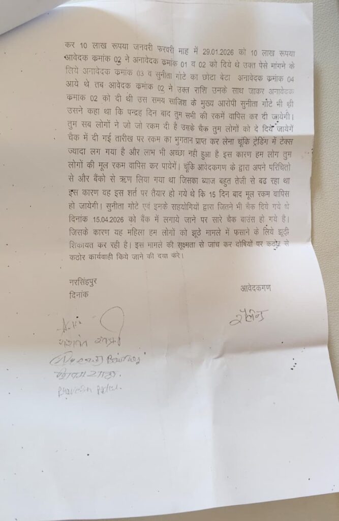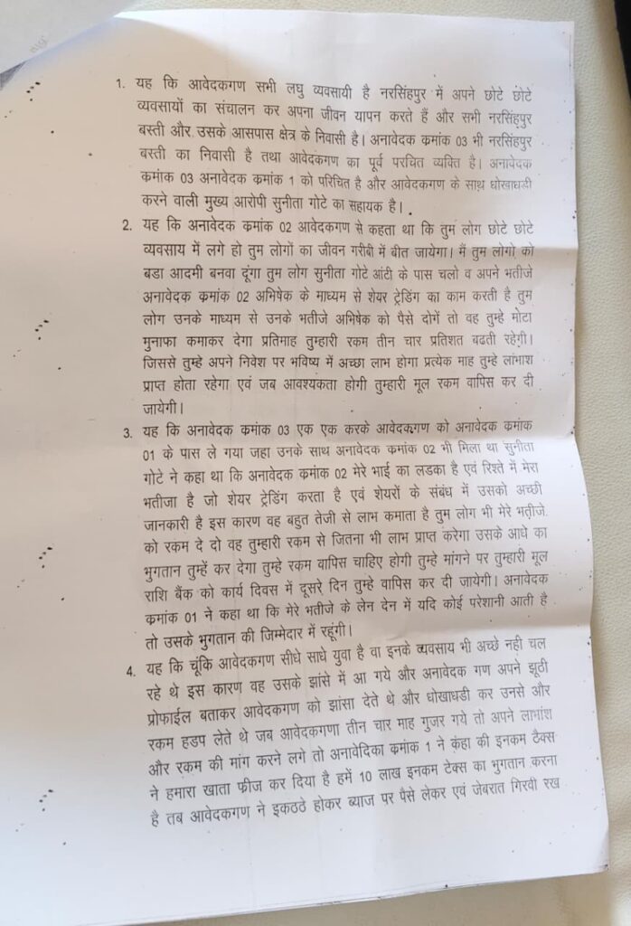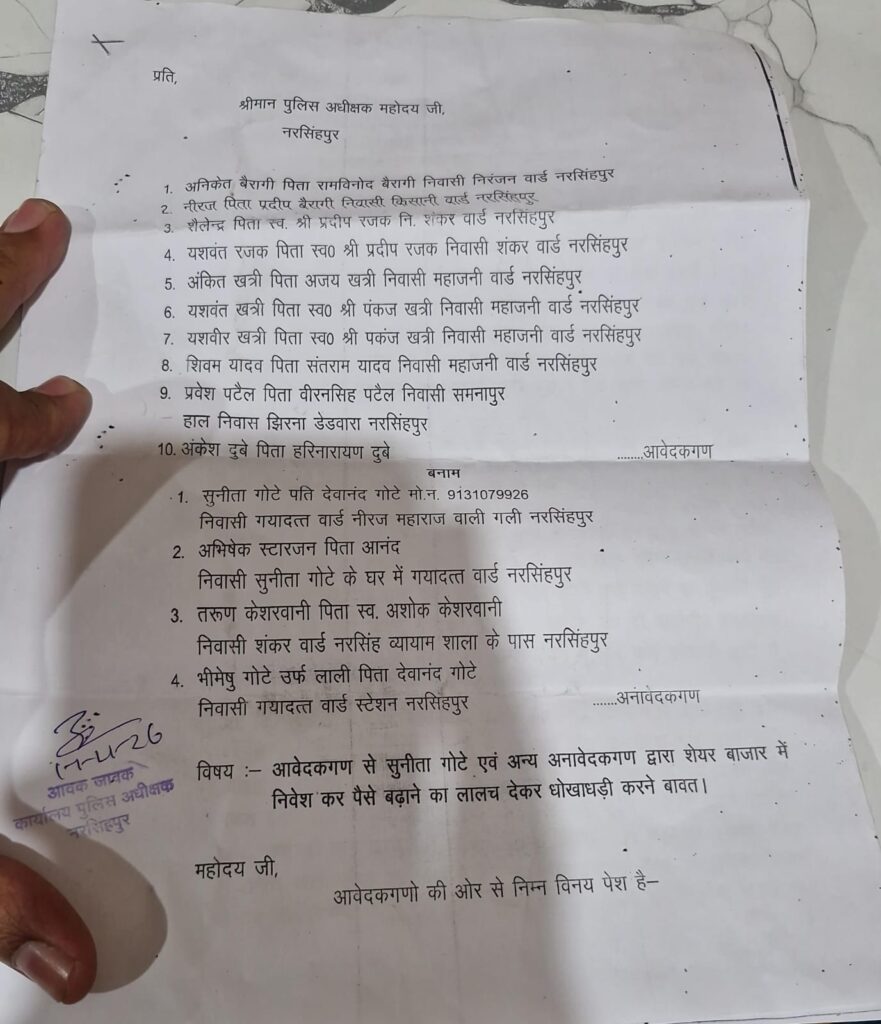 рдирд░рд╕рд┐рдВрд╣рдкреБрд░ рдореЗрдВ рд╢реЗрдпрд░ рдЯреНрд░реЗрдбрд┐рдВрдЧ рдХреЗ рдирд╛рдо рдкрд░ рдмрдбрд╝реЗ рд╕реНрддрд░ рдкрд░ рдирд┐рд╡реЗрд╢ рдЬреБрдЯрд╛рдиреЗ рдФрд░ рдмрд╛рдж рдореЗрдВ рднреБрдЧрддрд╛рди рди рд╣реЛрдиреЗ рдХрд╛ рдПрдХ рдЧрдВрднреАрд░ рдорд╛рдорд▓рд╛ рд╕рд╛рдордиреЗ рдЖрдпрд╛ рд╣реИред рд╢рд┐рдХрд╛рдпрддрдХрд░реНрддрд╛рдУрдВ рдХрд╛ рдЖрд░реЛрдк рд╣реИ рдХрд┐ рдЙрдиреНрд╣реЗрдВ рдЕрдзрд┐рдХ рдореБрдирд╛рдлреЗ рдХрд╛ рд▓рд╛рд▓рдЪ рджреЗрдХрд░ рдирд┐рд╡реЗрд╢ рдХрд░рд╛рдпрд╛ рдЧрдпрд╛ рдФрд░ рдмрд╛рдж рдореЗрдВ рд░рдХрдо рд╡рд╛рдкрд╕ рдХрд░рдиреЗ рдореЗрдВ рдЯрд╛рд▓рдордЯреЛрд▓ рдХреА рдЧрдИред