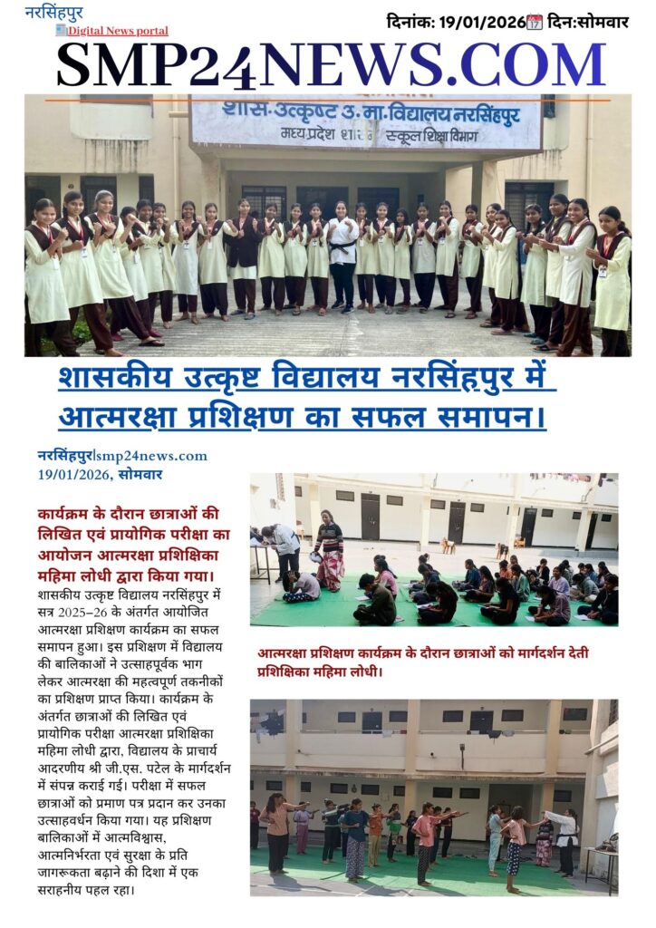 शासकीय उत्कृष्ट विद्यालय नरसिंहपुर में आत्मरक्षा प्रशिक्षण का सफल समापन।